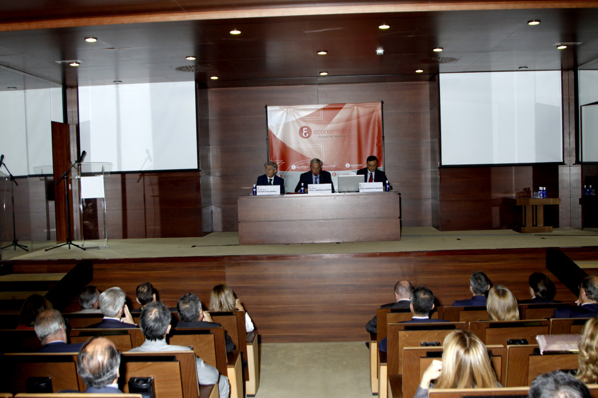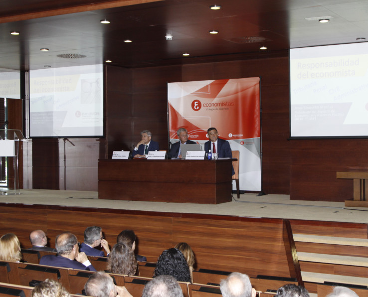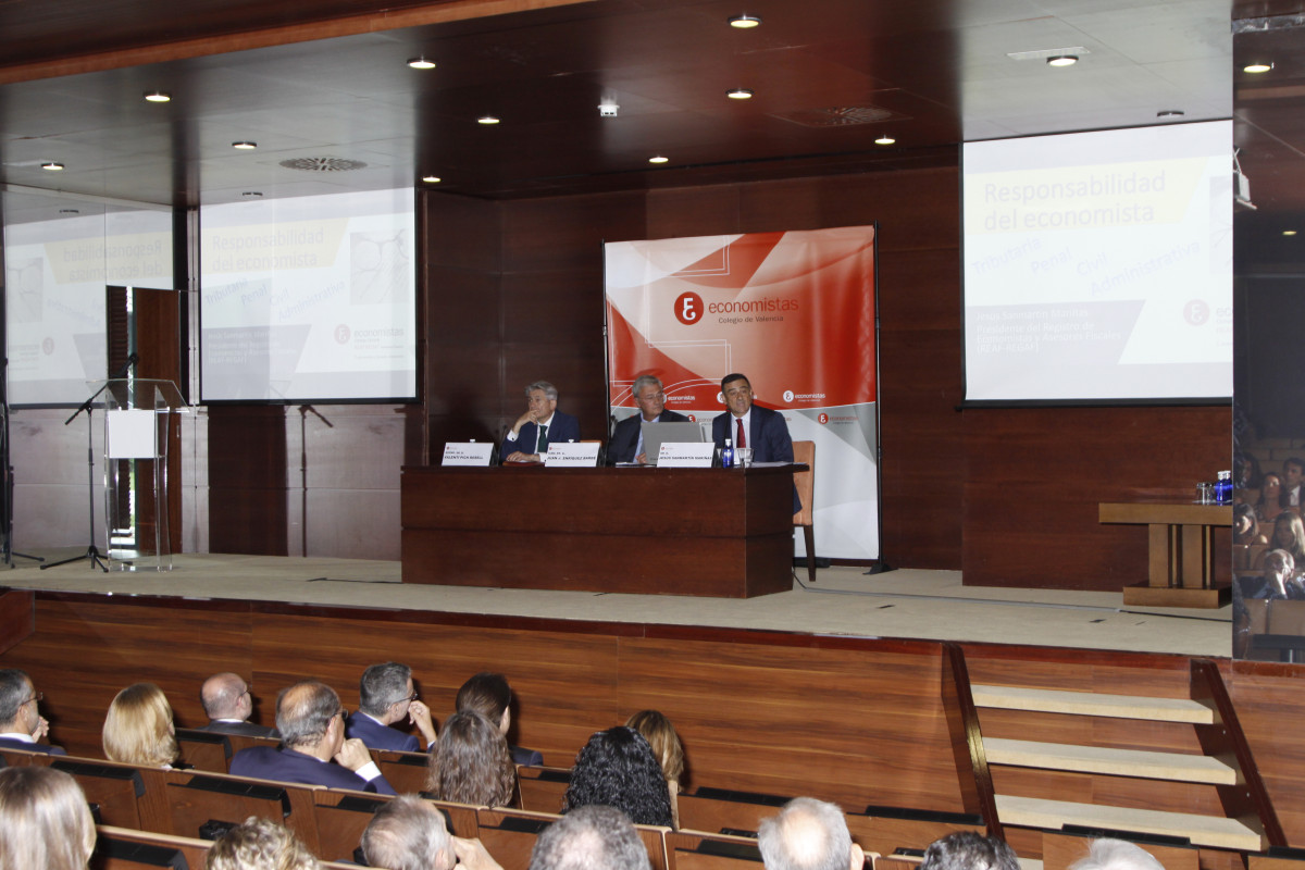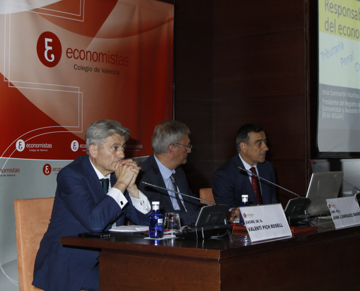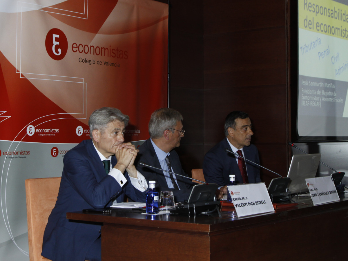 La ceremonia contó con la participación del decano del COEV, Juan José Enríquez; el presidente del Consejo General de Economistas, Valentí Pich; y el presidente del REAF, Jesús Sanmartín, quien pronunció la conferencia de clausura, titulada ‘Responsabilidad tributaria, civil y penal del economista’, con un estilo ameno y cercano que deleitó a los asistentes, ya que como él mismo apuntó, “el tema se las trae, así que vamos a tratar de no aburrir ni atemorizar a nadie”.