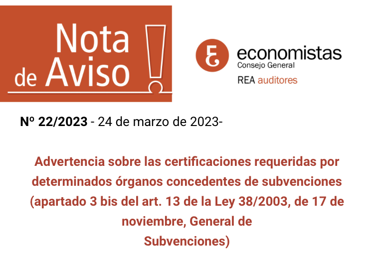 Los copresidentes de la Comisión de Contabilidad y Auditoría, Gregorio Labatut y Carmina Oliver informan de la advertencia del REA sobre las certificaciones de auditores de cuentas que requieren determinados organismos concedentes de subvenciones (apartado 3 bis del art. 13 de la Ley 38/2003, General de Subvenciones).